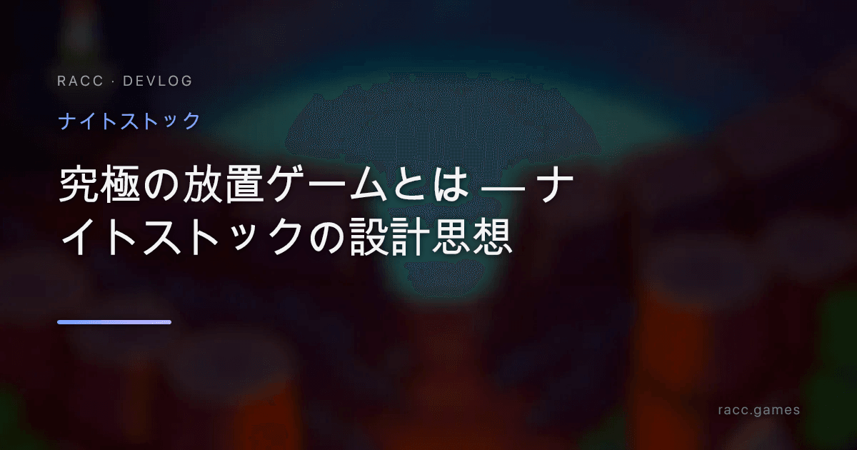 先日配信を開始したナイトストックについて、設計で考えていたことを書きます。「究極の放置ゲームとは何か」という問いから始まって、ゆっくり長く遊んでもらうための課金設計、ソロでコンテンツ量を確保するためにAIを相棒にしたことなど。ゲーム設計とソロ開発の話です。