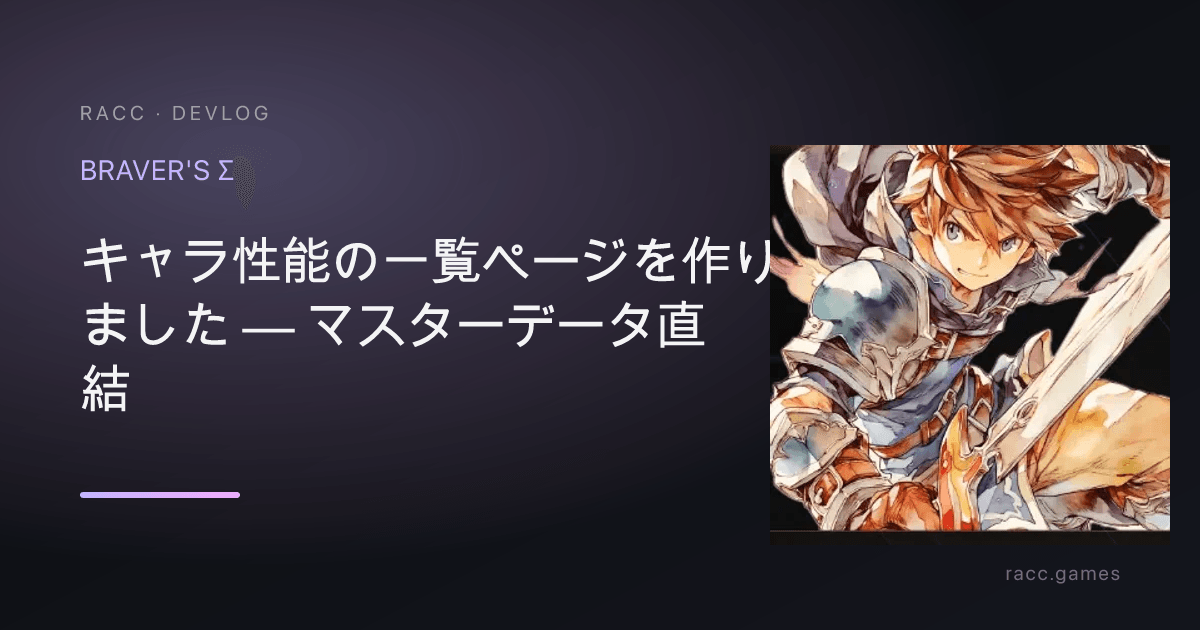 BRAVER'S Σ の公開済みキャラクターの★6時点の性能・スキル・専用能力を、マスターデータから自動生成した一覧ページを公開しました。常設/期間限定の区分け、スキル説明の自然言語化、画像最適化までビルド時に全自動で完結する仕組みです。